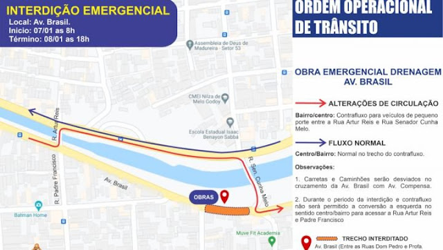 As carretas e os caminhões serão desviados no cruzamento da avenida Brasil com avenida Compensa e durante o período da interdição e contrafluxo, não será permitida a conversão à esquerda no sentido Centro/bairro para acessar as ruas Artur Reis e Padre Francisco.